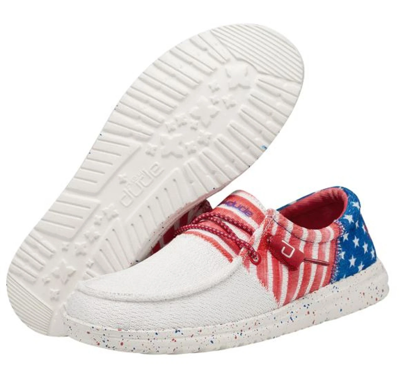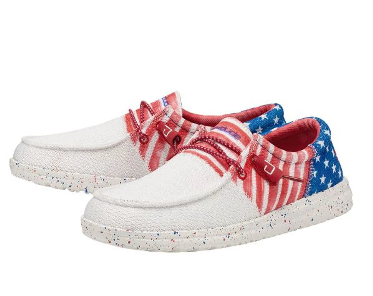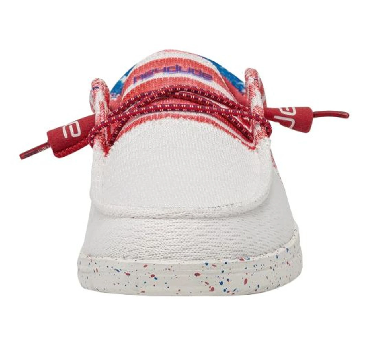 Our most popular moc meets sock-like comfort, and in colors that salute the red white & blue. The Wendy Sox collection showcases our classic style constructed in a stretch-polyester fabric without compromising support, made to hug your foot throughout. Built on an ultralight outsole and designed with our easy-on system, featuring no-tie elastic laces. Easy. breezy, on the go.Â
