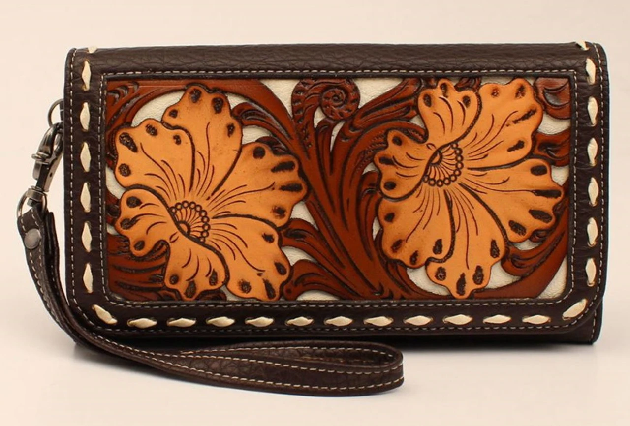 This Blazin Roxx clutch by M&F Western Products is from the Aaliyah collection. It has a brown and tan floral embossed flap over magnetic closure with white buck laced edges. Removable fringe clip.