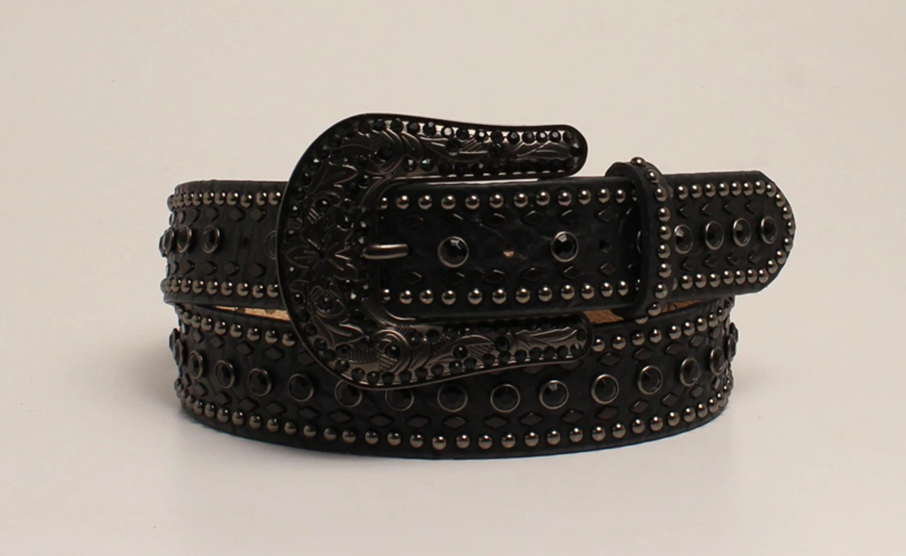 This trendy Nocona ladies belt by M&F Western Products will get you noticed. It features black and metallic colored nailhead trim with black rhinestone accents and a black rhinestone buckle.