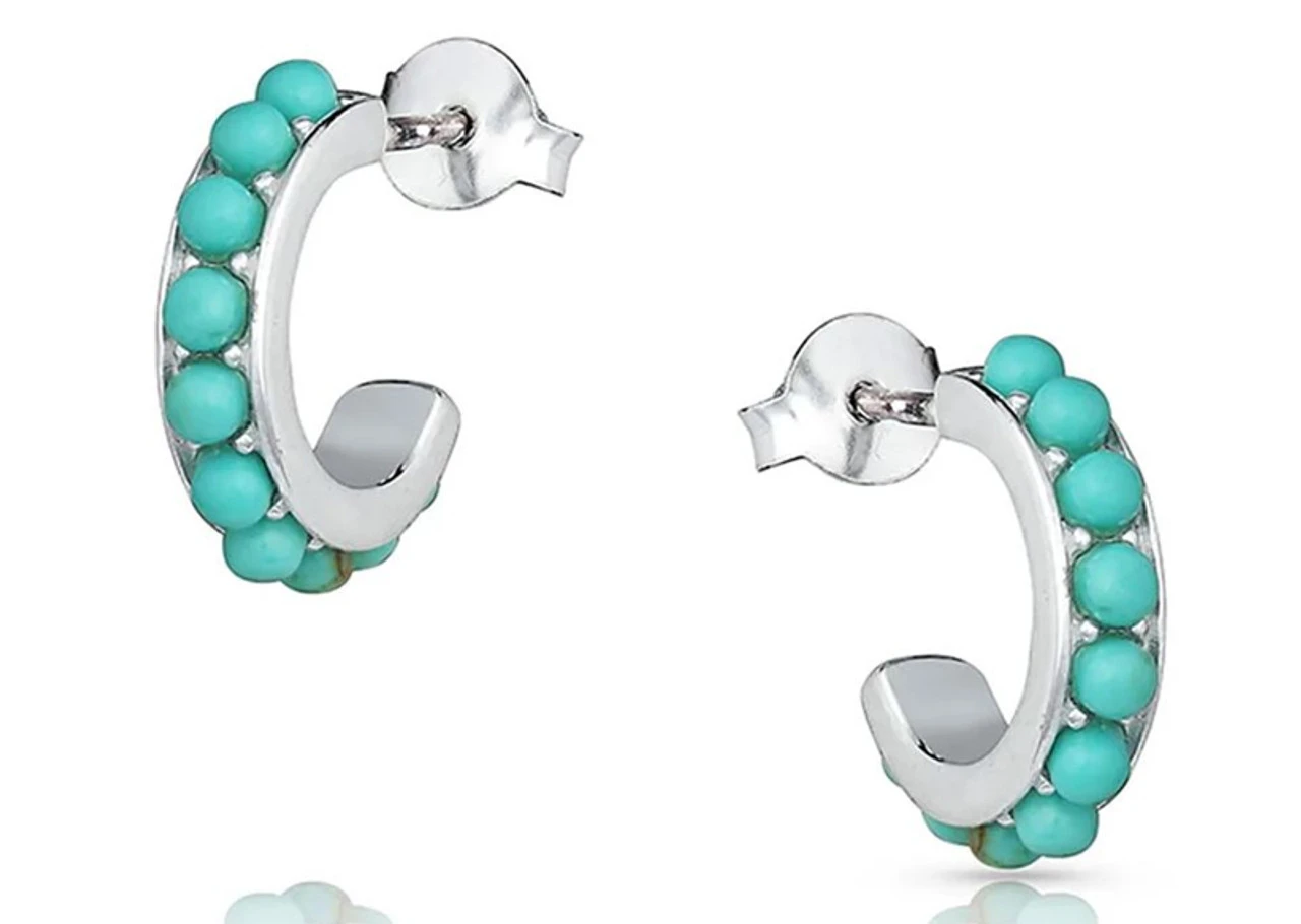Is it true that everything is cuter when it’s mini? Certainly the case with these beauties! Try on our small studded small hoop earrings. They are quaint with a large pop of color. Studs of turquoise line the curve of the hoop with fine, clean silver-toned lining both sides. Hypoallergenic stainless steel post backs fasten these earrings.