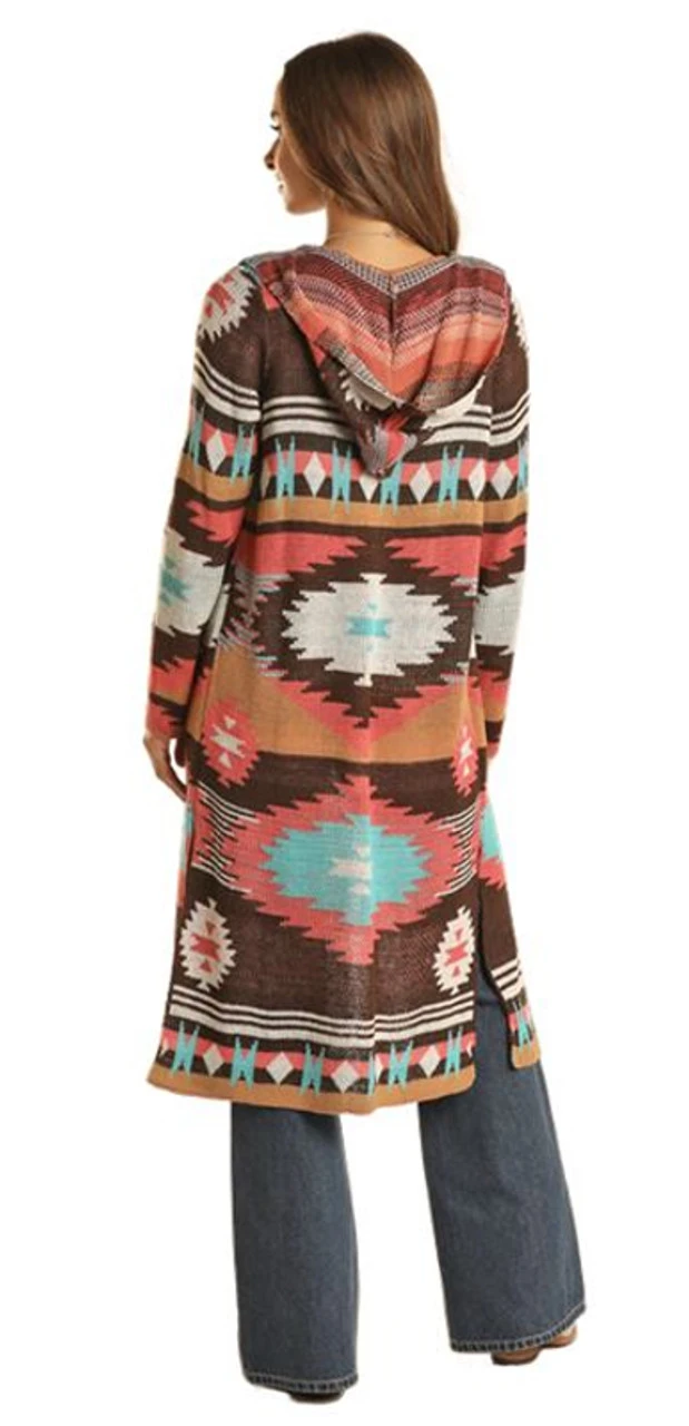 Rock and Roll Denim Women’s Chocolate Aztec Knit Hooded Long Sleeve Cardigan Orange, brown and aqua Aztec print Hooded open Front 100% Acrylic Aztec knit Long sleeve Cream
